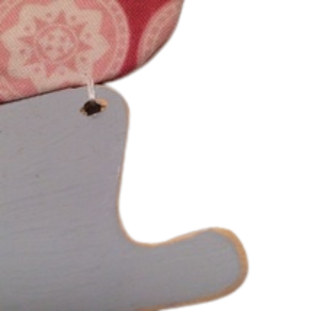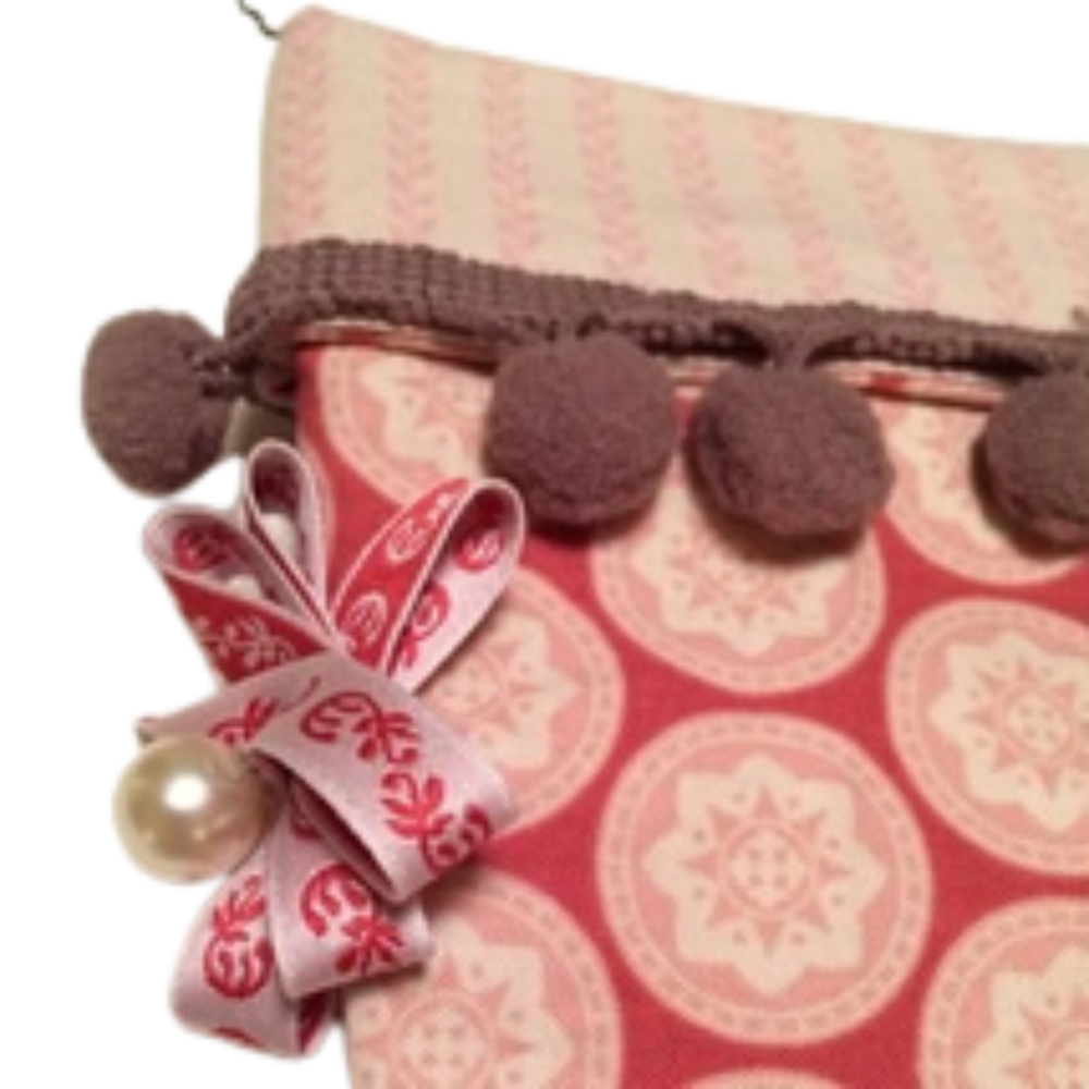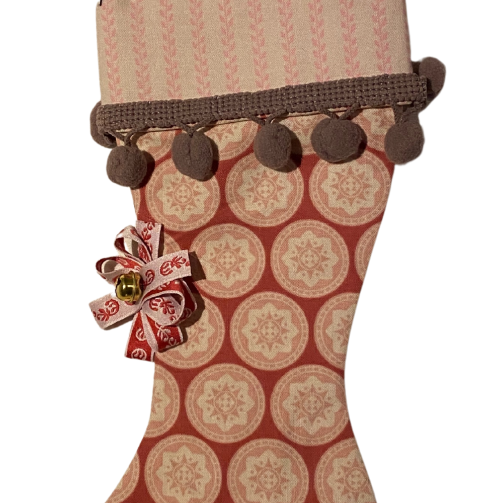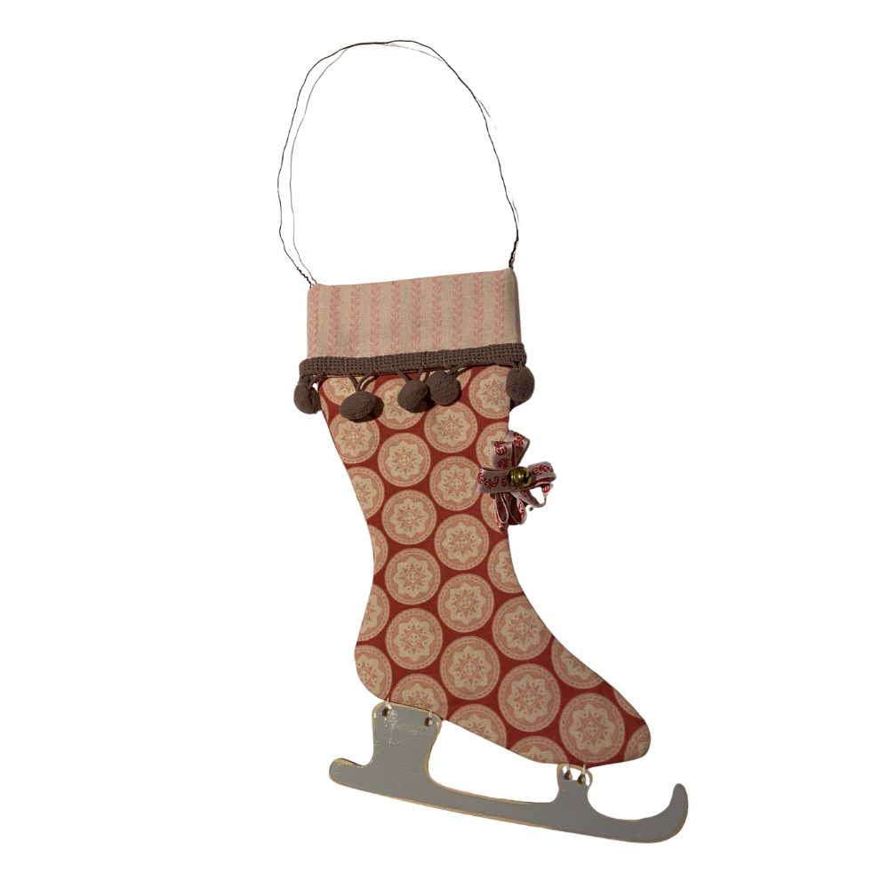Søt og forseggjort julestrømpe i lekre materialer. Hel lengde ca 23 cm + skøyten, bredde ca 10 cm. Fargene er Duse toner av rød, rosa og brun. Hanken er en stålstreng.