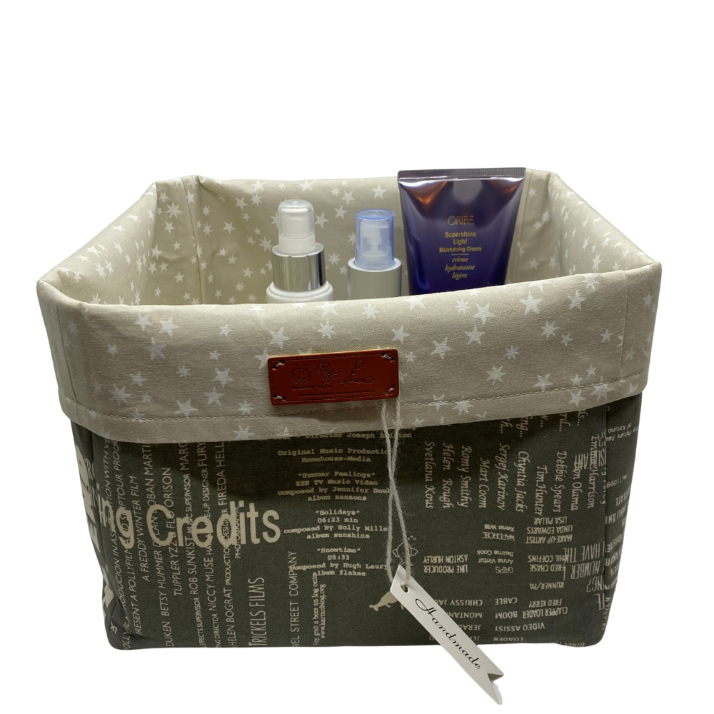 Stilig og praktisk kurv sydd i bomullsstoff. Avstivet med vlieselin innvendig, dette gir en stødig og god kurv. Dekorativt brunt «skinn»-merke på kanten når du bretter den ned. Kurven måler ca 25x25x25 cm når kanten er brettet opp.